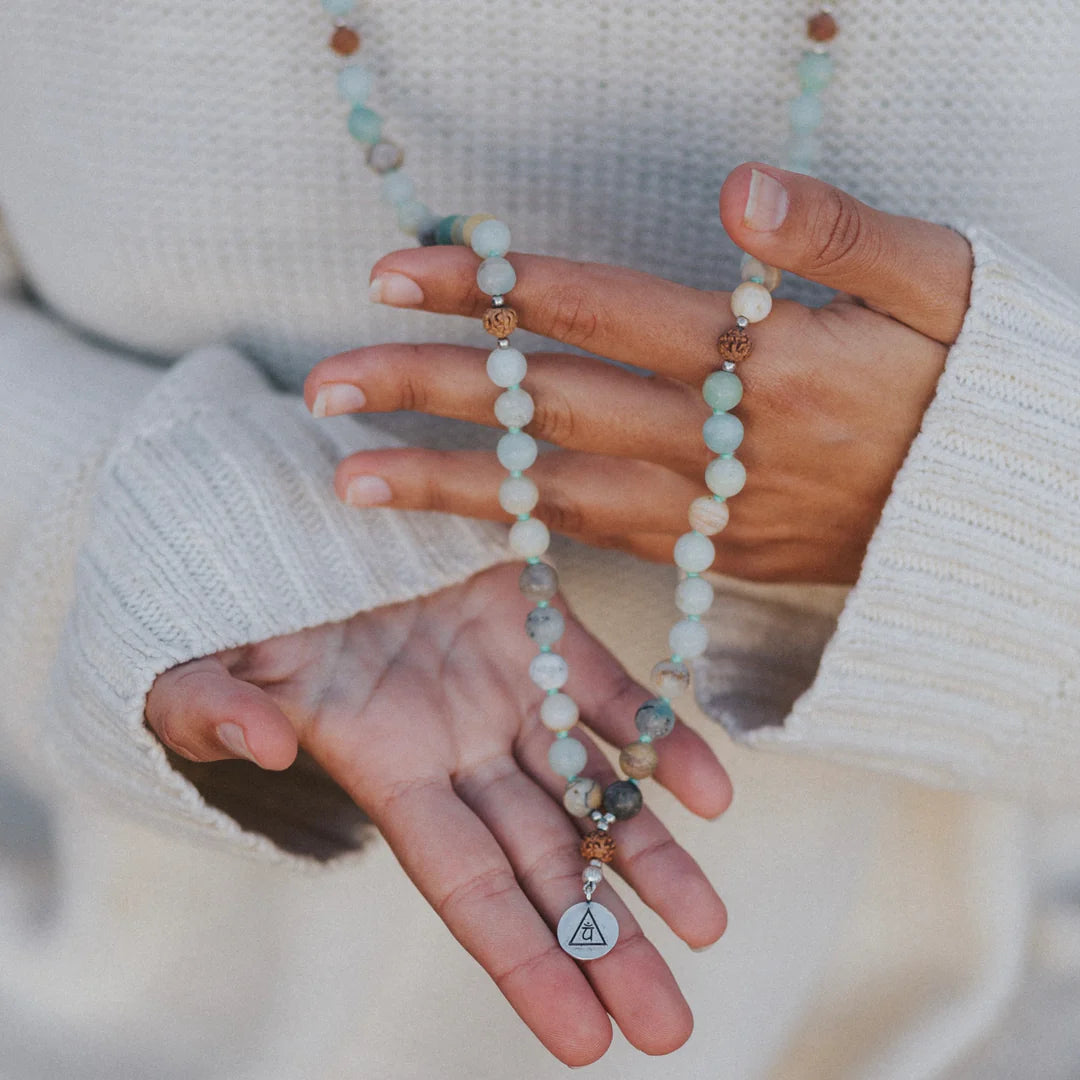 - The 108 precious beads of Amazonite and Rudraksha sacred seeds are thread meditatively by hand; the beads are around 7.5mm each.