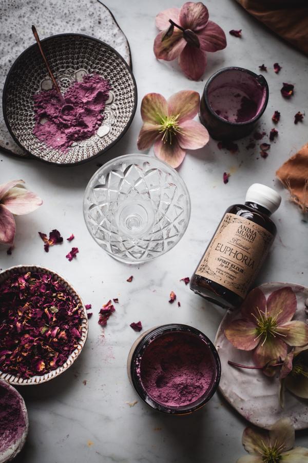 Add 1tsp (5ml) of Euphoria Elixir to tea, cacao, matcha, seltzer water, kombucha, mocktails, or even cocktails! We love it paired with the Rose Powder.